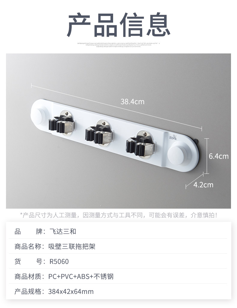品牌名称:jiuyou登录入口三和 生产地区:中国·浙江·台州 jiuyou登录入口货号:R5060 装箱数:24 jiuyou登录入口尺寸:38.4*4.2*6.4cm 外箱尺寸:48*23.5*45cm 条形码:6931643817516 jiuyou登录入口三和R5060 强力吸壁3联拖把架