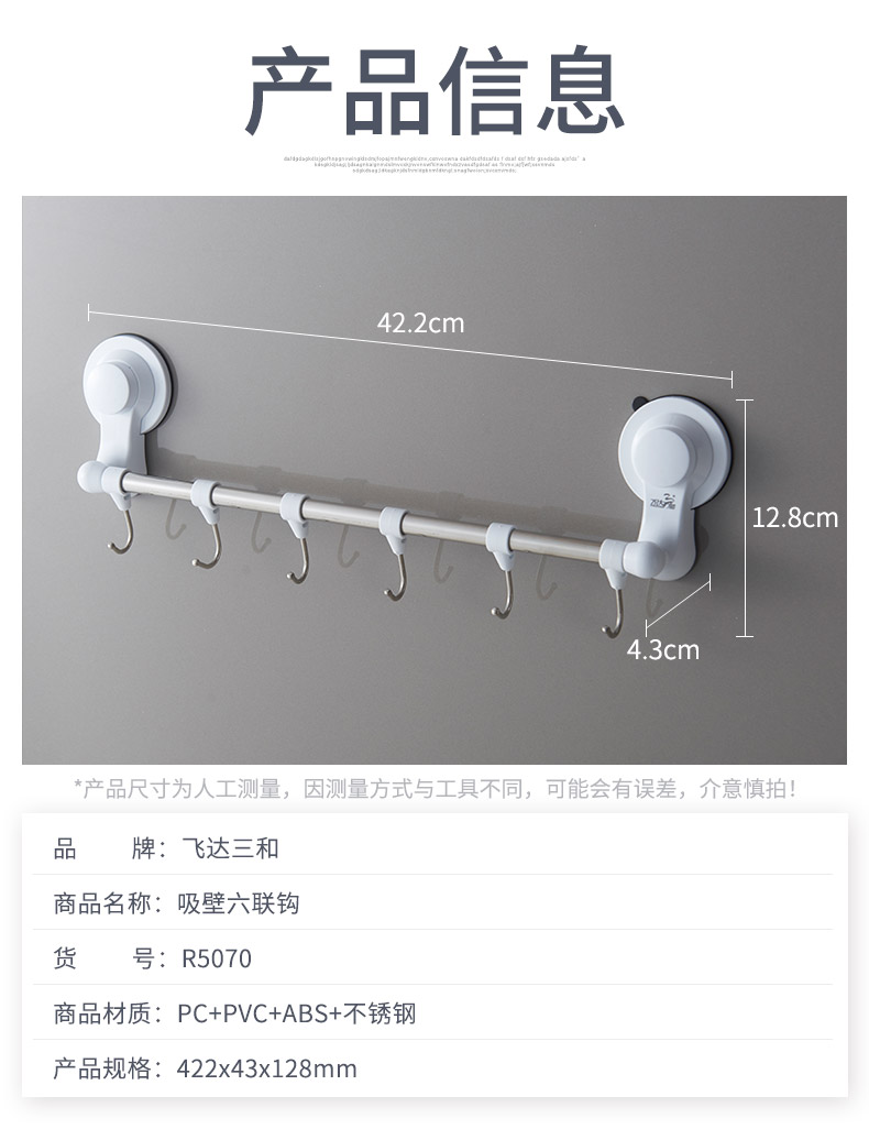 品牌名称:jiuyou登录入口三和 生产地区:中国·浙江·台州 jiuyou登录入口货号:R5070 装箱数:48 jiuyou登录入口尺寸:42.2*4.3*12.8cm 外箱尺寸:53*45.5*34.5cm 条形码:6931643817523 jiuyou登录入口三和R5070 强力吸壁六联钩