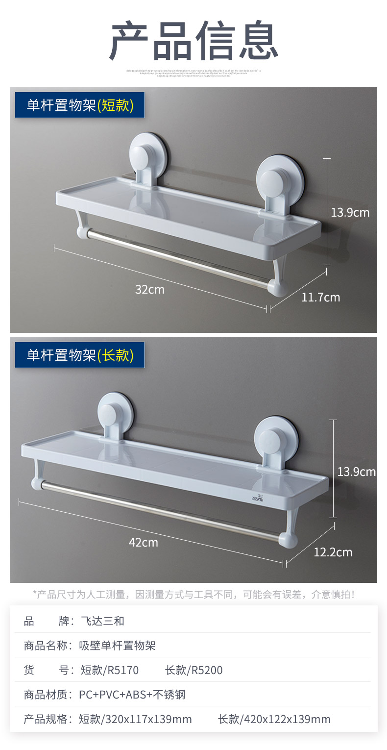 品牌名称:jiuyou登录入口三和 生产地区:中国·浙江·台州 jiuyou登录入口货号:R5170/R5200 装箱数:36 / 24 jiuyou登录入口尺寸:32*11.7*13.9 / 42*12.2*13.9cm 外箱尺寸:57*39.5*36.5 / 57*26.5*46.5cm 条形码:6931643817622 / 6931643817653 jiuyou登录入口三和R5170 / R5200 强力吸壁单杆置物架