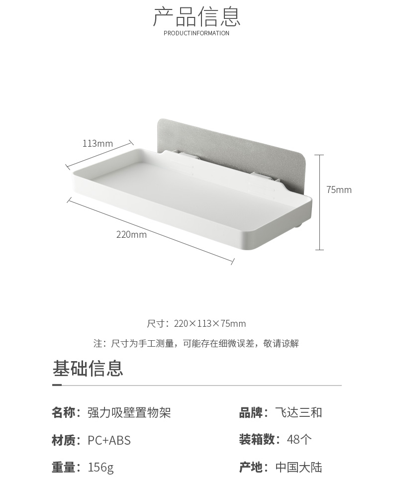 品牌名称:jiuyou登录入口三和 生产地区:中国·浙江·台州 jiuyou登录入口货号:R5450 装箱数:48 jiuyou登录入口尺寸:22*11.3*7.5cm 外箱尺寸:45*31.5*33.5cm 条形码:6931643818377 jiuyou登录入口三和R5450 强力吸壁置物架