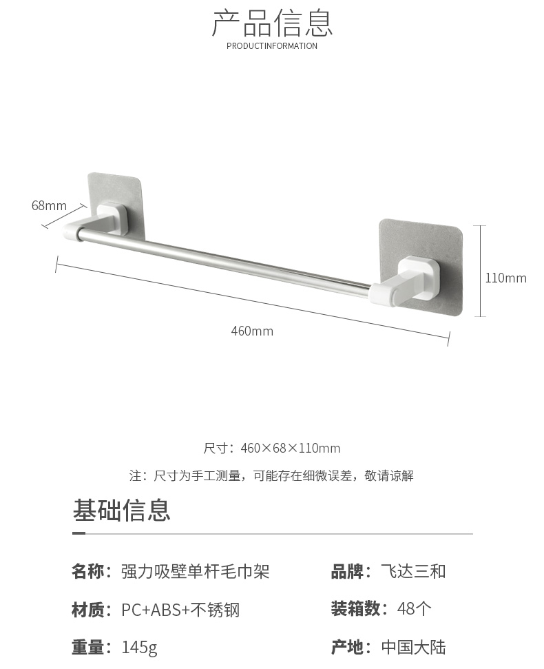 品牌名称:jiuyou登录入口三和 生产地区:中国·浙江·台州 jiuyou登录入口货号:R5470 装箱数:48 jiuyou登录入口尺寸:46*6.8*11cm 外箱尺寸:50*35*49.5cm 条形码:6931643818780 jiuyou登录入口三和R5470 强力吸壁单杆毛巾架