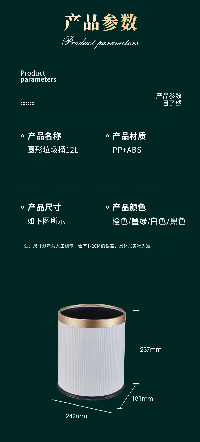 品牌名称:jiuyou登录入口三和 生产地区:中国·浙江·台州 jiuyou登录入口货号:TG3791 装箱数:12 jiuyou登录入口尺寸:23.5x23.5x27cm 外箱尺寸:71x48x54.5cm 条形码:6931643825047 jiuyou登录入口三和TG3791 圆形条纹垃圾桶 12L