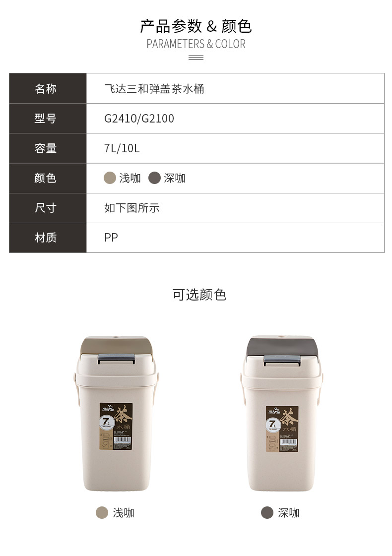 品牌名称:jiuyou登录入口三和 生产地区:中国·浙江·台州 jiuyou登录入口货号:G2100/G2410 装箱数:8/12 jiuyou登录入口尺寸:268*168*360mm/275*175*280 外箱尺寸:665*535*375/800*350*585 条形码:6931643812832/6931643815796 jiuyou登录入口三和G2100/G2410时尚茶水桶