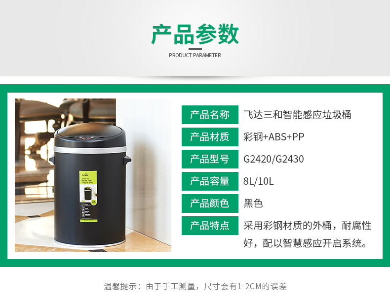 品牌名称:jiuyou登录入口三和 生产地区:中国·浙江·台州 jiuyou登录入口货号:G2420/G2430 装箱数:4/4 jiuyou登录入口尺寸:282*250*338mm/282*250*396mm 外箱尺寸:59.5*59.5*39.5cm/59.5*59.5*45.5cm 条形码:6931643816137 / 6931643816144 jiuyou登录入口三和G2420智能感应垃圾桶8L/G2430智能感应垃圾桶10L