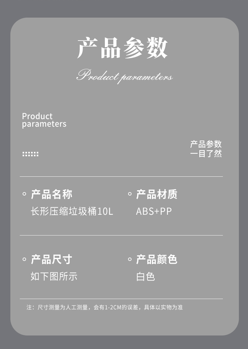 品牌名称:jiuyou登录入口三和 生产地区:中国·浙江·台州 jiuyou登录入口货号:TG3810 装箱数: jiuyou登录入口尺寸: 外箱尺寸: 条形码: jiuyou登录入口三和TG3810 长形压缩垃圾桶 10L