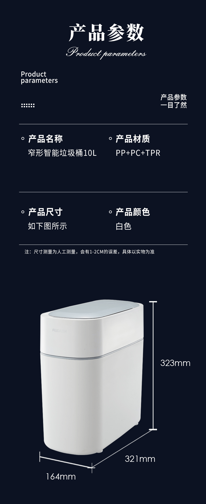 品牌名称:jiuyou登录入口三和 生产地区:中国·浙江·台州 jiuyou登录入口货号:TG6100 装箱数:1 jiuyou登录入口尺寸:32.3x16.4x31.8cm 外箱尺寸:33.5x17.5x33.5cm 条形码:6931643824934 jiuyou登录入口三和TG6100 窄形智能垃圾桶 10L